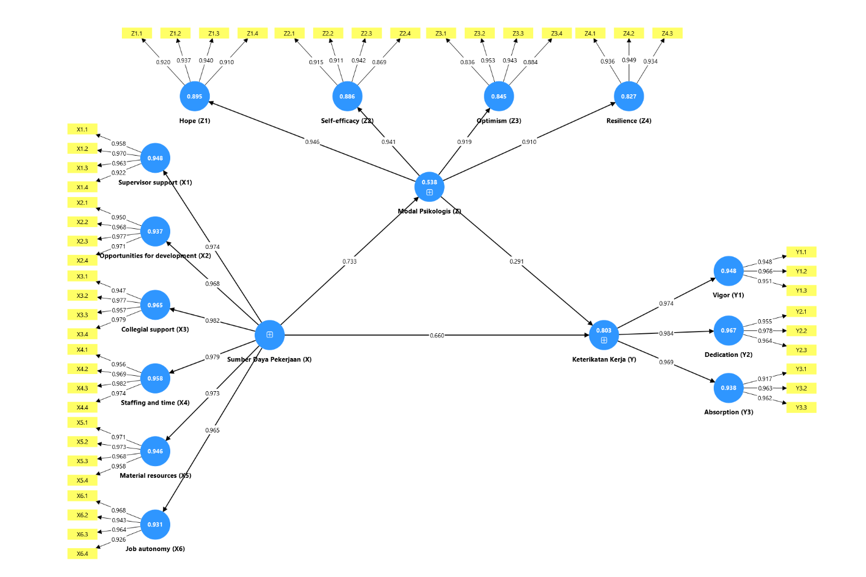 Based on Table 5.15, Job Resources have a positive and significant effect on work engagement and psychological capital. In addition, psychological capital also has a positive and significant effect on work engagement. These results show that all direct influence hypotheses in this study are accepted. The findings confirm the Job Demands–Resources (JD-R) Theory, that job resources play a direct role in increasing work engagement and indirectly through strengthening employee psychological capital.