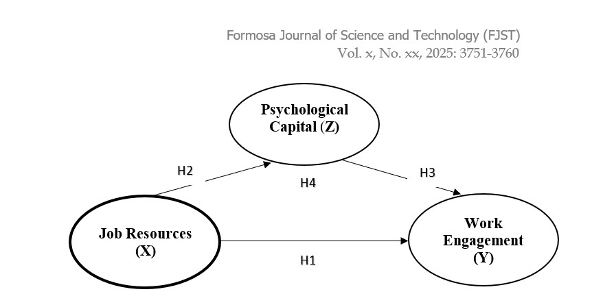 Based on the Job Demands–Resources Theory (JD-R Theory), this study confirms that job resources play a role in reducing job demands and increasing motivation and attachment to work (Bakker & Demerouti, 2017; Demerouti et al., 2021). In addition to these direct influences, psychological capital consisting of hope, self-efficacy, optimism, and resilience is positioned as a mediating variable that strengthens work engagement. Based on theoretical and empirical studies, this study builds a conceptual model with job resources as an exogenous variable, work engagement as an endogenous variable, and psychological capital as a mediating variable.